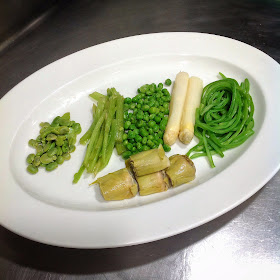 En las fotos y vídeos se puede ver la secuencia de elaboración, pero básicamente lo que hace Juan, el cocinero de ErreJota, es hervir brevemente cada de las verduras en agua con aceite y sal, excepto los espárragos que se cuecen con azúcar y sin aceite, y las alcachofas que se cuecen además en blanqueta (agua con harina para que no se oxide). Además de cocerlas, las alcachofas se fríen con jamón, que será el único bocado cárnico que figura en el plato. Una vez tiene cada de las verduras cocinadas en su punto, el conjunto se salsea con un fondo de cordero, haciendo que cada bocado de las diferentes verduras tenga un regusto sabroso y sustancioso.